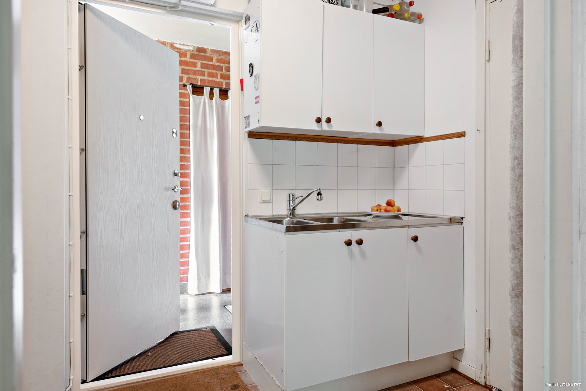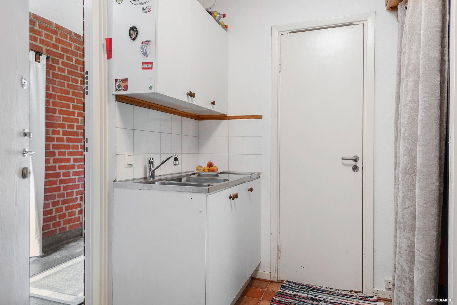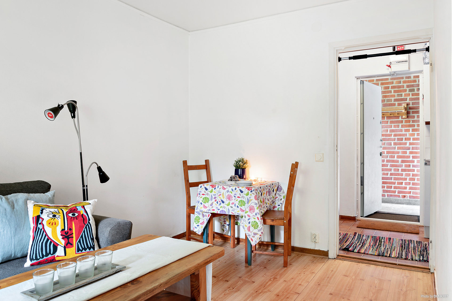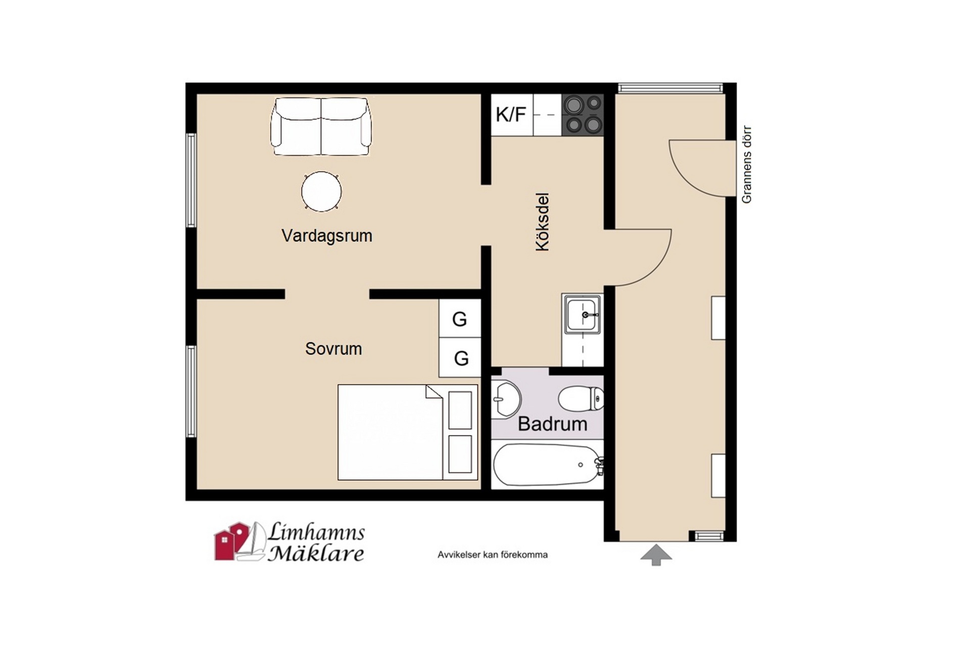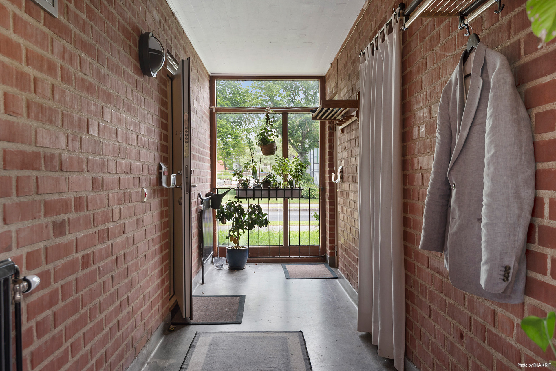 Bostadsrätten är på 34 kvm. Framför lägenheten finns en gemensam yta som man använder tillsammans med grannlägenheten. Denna yta har två stycken hatthyllor, en till varje bostad och ytan används som hall. Denna hall är inte medräknad i lägenhetsytan.